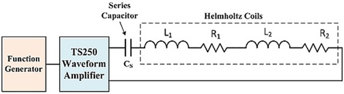 图6:用波形放大器直接驱动一对串联亥姆霍兹线圈的电路图。
