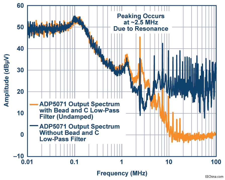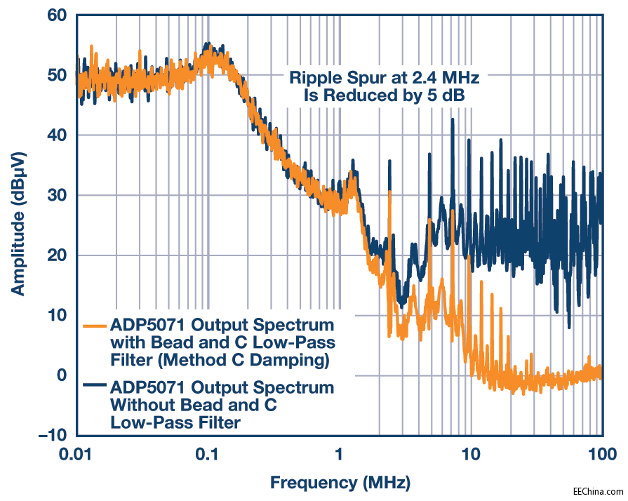 图9. 采用阻尼方法C时的ADP5071频谱输出以及磁珠和电容低 通滤波器。