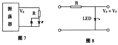 (3)单LED电平指示电路。在放大器、振荡器或脉冲数字电路的输出端,可用LED表示输出信号是否正常,如图7所示。R为限流电阻。只有当输出电压大于LED的阈值电压时,LED才可能发光。