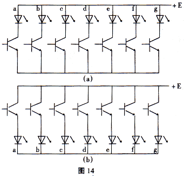 (1)如果数码宇航局为共阳极形式,那么它的驱动级应为集电极开路(OC)结构,如图14(a)所示。