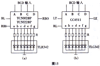 ① 静态驱动:静态驱动也称直流驱动。静态驱动是指每个数码管各用一个笔画译码器(如BCD码二-十进制译码器)译码驱动。图15是一位数码管的静态驱动之例。图集成电路TC5002BP内含有射极输出驱动级,所以采用共阴极数码管。A、B、C、D端为BCD码(二-十进制的8421码)输入端,BL为数码管熄灭及显示状态控制端,R为外接电阻。