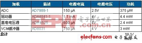 许多放大器在此应用中可用于缓冲目的。 AD8031 是一款单电源电压反馈型放大器 ,具有高速性能,小信号带宽为80 MHz,压摆率为30 V/μs,建立时间为125 ns。该放大器为带容性负载的单位增益稳定型放大器,采用3.3 V单电源时功耗低于2.5 mW。 AD8031采用5引脚SOT-23、8引脚SOIC、8引脚PDIP和8引脚MSOP封装。在此电路中,AD8031 用于缓冲到达分压器的2.5 V基准电压,该分压器为 ADA4841-1的输入提供所需的1.25 V共模电压。表2中显示了缓冲器使用的额外功率。