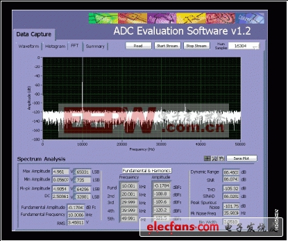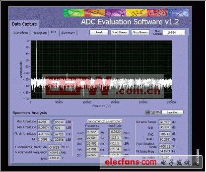 图7和图8分别显示了 AD7988-1 和 AD7988-5的性能,同时使用 AD8032 放大器建立VCM电平并缓冲基准电压,如图6所示。此电路实施于 EVAL-CN0255-SDPZ 评估板上。