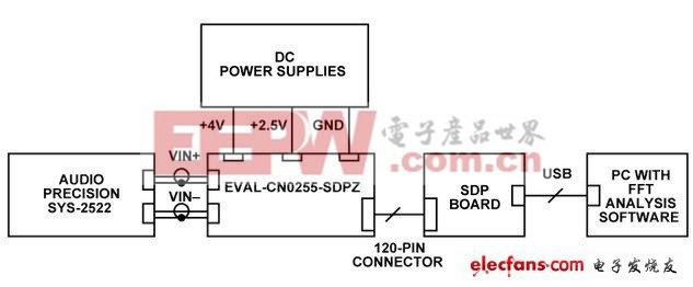 The block diagram of the ac performance measurement setup is shown in Figure 9. Connect the 2.5 V and 4 V power supply to the evaluation board power terminal.