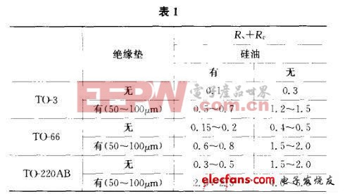 绝缘垫是用于半导体器件和散热器之间的绝缘。绝缘垫的热阻抗θs取决于绝缘材料的材质、厚度、面积。下表中列出几种常用半导体封装形式的θs+θc