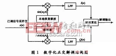 采用正交解调获得I/Q两路正交信号时,可以较容易地获得信号的三个特征:瞬时幅度、瞬时相位和瞬时频率,它们都是信号识别解调的基础。理想情况下,数字正交解调精度高,误差小。但其存在很大的局限性,在解调过程中需要本地恢复载波,往往需要用到数控振荡器或锁相环等器件,电路很复杂,因其恢复本地载波效果直接关系到最后的输出效果及误差,所以对器件要求较高,非常耗费资源。