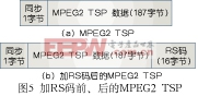 外编码为缩短的RS(里德一索罗门)码(204、188、t=8),采用伽罗华域GF(28)的码元,域生成多项式为P(x)=X8+X4+X3+X2+1,码生成多项式为(X-1)(X-a)(X-a2)(X-a3)……(X-a15),a=02HEX0加上RS码前、后的TSP(传送流包),如图5所示。