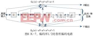 图6示出了约束长度K=7、基本编码率为1/2的卷积编码电路。可供选择的内码编码率及此时的缩短式传送信号(缩短码)示于表4。