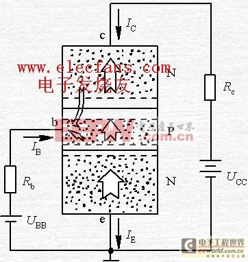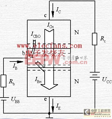 发射极电流IE也由两部分组成:IEn和IEp。IEn为发射区发射的电子所形成的电流, IEp是由基区向发射区扩散的空穴所形成的电流。因为发射区是重掺杂, 所以IEp忽略不计, 即IE≈IEn。IEn又分成两部分, 主要部分是ICn, 极少部分是IBn。IBn是电子在基区与空穴复合时所形成的电流, 基区空穴是由电源UBB提供的,故它是基极电流的一部分。 ?