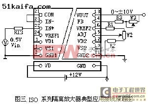 三、典型应用技术 图三、为ISO系列隔离放大器典型应用接线原理图,其中输入和输出放大器都为跟随方式。此时隔离放大器的整体放大倍数为20倍,R1,R2和W1为调零电路,R1=5.1K R2=2K W1=2K(多圈电位器)。
