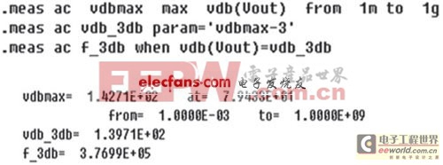 对输出的增益进行仿真,如图7所示。可见最大增益为143dB。在-3dB处增益为143dB,频率为377kHz。用。meas语句测试其最大增益、-3dB增益和-3dB增益频率如图8所示。