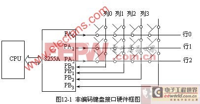 3×4的矩阵键盘通过并行接口芯片8255A与微机相连。8255A的A口定义为输出口,与键盘行线相连;B口定义为输入口,与键盘列线相连。设8255A A口地址为40H,B口地址为41H,控制寄存器地址为43H。
