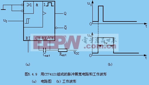 图5.4.9(a)所示为利用CT74121组成的脉冲展宽电路。