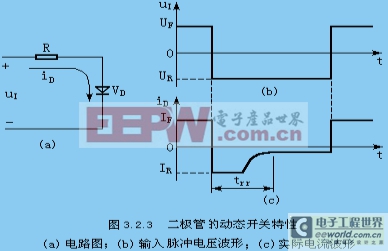 当输入电压UI 由正值UF 跃变为负值UR 的瞬间,VD 并不能立刻截止,而是在外加反向电压 UR作用下,产生了很大的反向电流IR ,这时 iD= IR≈- UR/R,经一段时间 trr后二极管VD 才进人截止状态,如图3. 2. 3 (c) 所示。通常将trr 称作反向恢复时间。