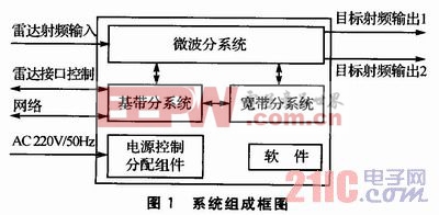 宽带目标模拟主要由基带分系统控制宽带分系统实现,如图2所示。输出通过微波分系统与窄带目标信号一起输出。电源控制分配组件完成系统主电源的控制、分配、保护和指示等功能。