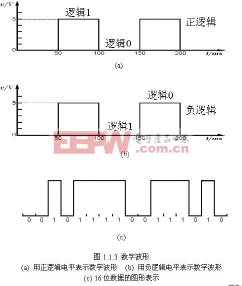 图1.1.3表示用逻辑电平描述的数字波形,其中图1.1.3a的逻辑0表示0V,逻辑1表示5V;图1.1.3b的逻辑0表示5V,逻辑1表示0V;图1.1.3c 则是一个16位长数据的图形表示。