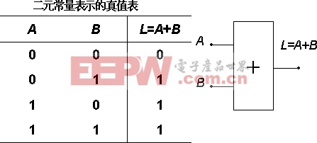 (c) 用0、1表示的真值表 (d) 或逻辑门电路的符号