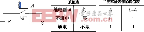 如图1.5.3(a)所示,电压V通过一继电器触点向灯泡供电,NC为继电器A的动断(常闭)触点,当A不通电时,灯亮;而当A通电时,灯不亮。其真值表如图1.5.3(b)所示。由此可总结出第三重逻辑关系:“