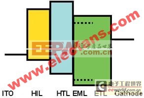 在阴极金属与阳极ITO之间,目前广为应用的元件结构一般而言可分为5层。如图二所示,从靠近ITO侧依序为:空穴注入层、空穴传输层、发光层、电子传输层、电子注入层。就OLED组件演进历史中,1987年Kodak首次发表之OLED组件,系由两层有机材料所构成,分别为空穴传输层及电子传输层。其中空穴传输层为p型之有机材料,其特性为具有较高之空穴迁移率,且其最高占据之分子轨域(Highest occupied molecule orbital,HOMO)与ITO较接近,可使空穴由ITO注入有机层之能障降低。