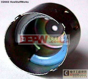 您可以看到这是一个小型电动机,与一毛钱的美元硬币差不多大小。从外部看,可以看到构成电动机机体的钢结构、一根轴、一个尼龙端盖和两条电池导线。如果将电动机的电池导线接到手电筒的电池上,轴就会转动。如果将导线反接,则轴会朝反方向转动。下面是同一电动机的其他两个视图。(请注意第二个视图中钢壳一侧的两个槽,稍后您就会明白它们是用来干什么的了)
