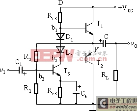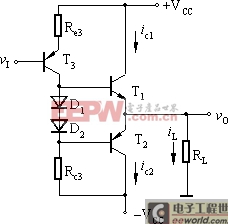 由图可见,T3组成前置放大级(注意,图中未画出T3的偏置电路),T1和T2组成互补输出级。静态时,在D1、D2上产生的压降为T1、T2提供了一个适当的偏压,使之处于微导通状态。由于电路对称,静态时iC1= iC2 ,iL= 0, vo =0。有信号时,由于电路工作在甲乙类,即使vi很小(D1和D2的交流电阻也小),基本上可线性地进行放大。