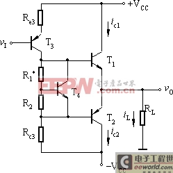 上述情况是理想的。实际上,图1的输出电压幅值达不到Vom= VCC/2,这是因为当vi为负半周时,T1导电,因而iB1增加,由于Rc3上的压降和vBE1的存在,当K点电位向+VCC接近时,T1的基流将受限制而不能增加很多,因而也就限制了T1输向负载的电流,使RL两端得不到足够的电压变化量,致使Vom明显小于VCC/2。