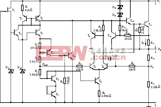 式中VZ2为DZ2的稳定电压,VBE为T3、D1、D2发射结(D1、D2为由发射结构成的二极管)的正向电压值。在电路设计和工艺上使具有正温度系数的R1、R2、DZ2与具有负温度系数的T3、D1、D2发射结互相补偿,可使基准电压VREF基本上不随温度变化。同时,对稳压管DZ2采用恒流源供电,从而保证基准电压不受输入电压波动的影响。