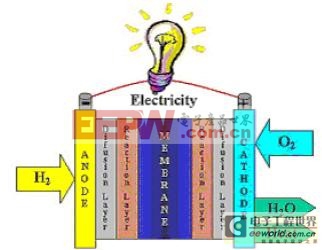 所有燃料电池的基本工作原理都是相同的:将氢的化学能转化为电能。人们已经研究出数种不同类型的燃料电池技术。除了PEM、PAFC和SOFC之外,还有碱性燃料电池(AFC)和熔融碳酸盐(MC)燃料电池。PEM燃料电池因其相对较低的工作温度和较高的效率而广泛用于汽车工业中。图3所示为PEM燃料电池的工作方式。
