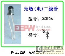 光敏二极管在电路中的符号如图Z0129 所示。光敏二极管使用时要反向接入电路中,即正极接电源负极,负极接电源正极。