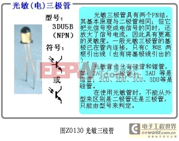 光敏三极管和普通三极管的结构相类似。不同之处是光敏三极管必须有一个对光敏感的PN结作为感光面,一般用集电结作为受光结,因此,光敏二极管实质上是一种相当于在基极和集电极之间接有光敏二极管的普通二极管。其结构 及符号如图Z0130所示。