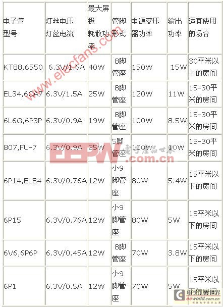 表1中的输出功率值与屏极工作电压和负载阻抗(输出变压器初级阻抗)有很大关系,任何一个数据的变化都会引起输出功率值的变化。适宜使用的场合与所用音箱的灵敏度有关,灵敏度越高使用面积越大。
