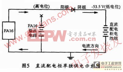 由于二极管的阴极电位比阳极高,因而处于截止、不导通的状态,从而有效阻隔了上图中的逆时针电流,因此FAl6整流电源不会对直流配电柜电池组产生充电效果,这样,配电柜自然就不会出现异常告警。