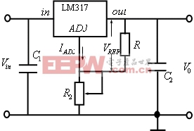其中,VREF=1.25V,而Iadj很小,通常略去,所以,由公式可得,只要调节R2就能在一定范围调节输出电压的大小。