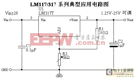 lm317可调稳压电路图:LM317是普通的可调集成稳压器,最大输出电流为2.2A,输出电压范围为1.25~37V。电路图如下: