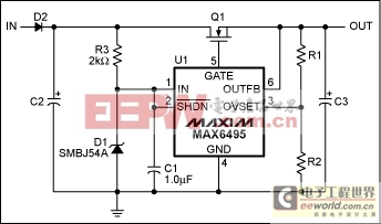 MAX6495–MAX6499/MAX6397/MAX6398过压保护(OVP)器件用于保护后续电路免受甩负载或瞬间高压的破坏。器件通过控制外部串联在电源线上的n沟道MOSFET实现。当电压超过用户设置的过压门限时,拉低MOSFET的栅极,MOSFET关断,将负载与输入电源断开。过压保护(OVP)器件数据资料中提供的典型电路可以满足大多数应用的需求(图1)。然而,有些应用需要对基本电路进行适当修改。本文讨论了两种类似应用:增大电路的最大输入电压,在过压情况发生时利用输出电容存储能量。