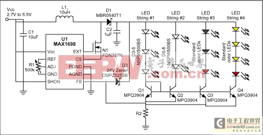 The circuit in Figure 1 drives the LED strings via transistors Q1-Q4, which operate as current mirrors. This technique offers the following advantages: