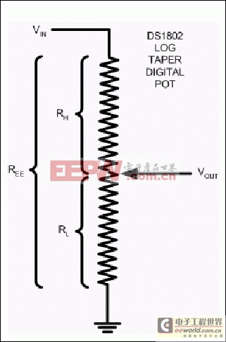 with RH = defined as the high-side of the DS1802, RL defined as the low side of the DS1802, REE defined as the end-to-end resistance, and VOUT and VIN defined as the output and input signals, respectively, as shown in Figure 1.