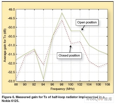 实测G/T下降以及RadioAnt增益如图4所示,对诺基亚6125手机的应用如图5所示。该手机可以工作在两种模式下,开放和关闭,具有不同的性能。通常,由于更长的屏蔽盒长度,开放位置要优于关闭位置几个dB,但预计关闭位置将主要用于收听期间。尽管增益具有大约20dB带内差异、G/T 退化的高度谐振,它是有益于接收和音频质量的重要指标,该增益几乎是平坦的,具有大约5dB的带内差异。因此,就不要求可调协性。然而,RadioAnt 模块支持频率可调协性(如果可以从FM接收器获得控制信号),其将在频带边沿将接收到的SNR水平改善几个dB(尤其是,如果必须覆盖整个76MHz到 108MHz频带),并还将提高强大的带内阻断信号的容差。这是一个可选特性,并且对获得良好性能而言并不必要。