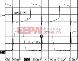 实验波形如图4—图6所示。图4为原边电流波形和开关S1上的电压波形,开通时,开关管中的电流从零开始逐渐增加,开关管以ZVS关断后,原边以恒流给开关管的漏源结电容充电。图5和图6分别为驱动电压和开关S1和S2上的电压波形,可以看出,在开关S1和S2关断的后期,上管S1上的电压下降很少,而下管S2上的电压下降很多。