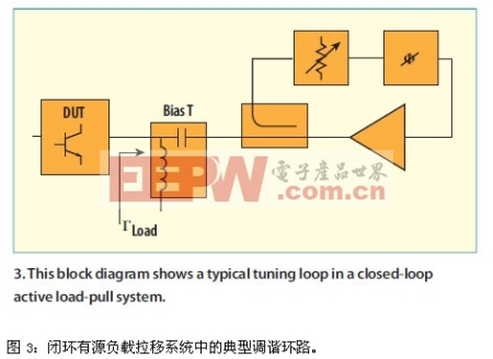 自从20世纪70年代后,IEEE出版物中就引用了有源闭环负载拉移方法。这种方法使用放大版的b2作为反射信号a2。为了达到这个目的,需要使用耦合器或环形器引导来自DUT的信号b2经过可变放大级电路控制幅度和相位,最后重新将信号作为a2回注入器件。图3显示了典型闭环系统的功能框图。