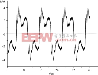 根据原理分析及仿真验证,开发了一台700W的电源样机,已经成功使用在380V限流器实验装置中,实现了长期可靠运行。用一无感电阻对输出电流i2取样,并把示波器采集的数据用Origin数据分析软件还原,波形如图6所示。电源样机每个输出变压器的副边绕组都是3匝。每路驱动电源的负载阻抗都是25Ω。它的主要特性如下:驱动电源路数为12(可以更大);每路驱动电源输出功率可达20W;各路驱动电源之间的隔离电压为40kV。