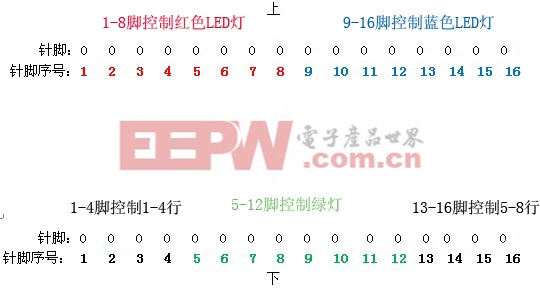 由图3我们可以看出,该点阵模块针脚的排列是有一定规律的。即上半部分的1-8针脚控制红灯,9-16脚控制蓝灯,下半部分的5-12脚控制绿灯,它们都是控制列的,各接到PCB驱动板上的MBI5024驱动芯片。下半部分的1-4脚和13-16脚控制行,接到4953行控制芯片。这个时候有个问题是,点阵模块上为什么没有设置公共地呢?公共地实际上是在驱动芯片上。