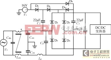 在无源功率因数校正的基础上采用了一种新颖的辅助电路来减小滤波器的体积及重量,同时进一步提高功率因数,减小电流谐波。辅助电路采用了小信号二极管和小容量的电容来实现。电路结构如图3所示。