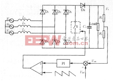 由于无论是三相六开关PFC还是由单相PFC组成的三相PFC成本都比较高,所以人们一直在寻找更简单有效的三相PFC拓扑。于是文献[5]中提出了三相单开关PFC拓扑结构。三相单开关PFC电路及其控制框图如图8所示。三相单开关PFC电路可以看成是单相电流断续(DCM)PFC在三相电路中的延伸[5,6]。控制中只有一个电压环,输出电压与参考电压的误差经过放大后与三角波比较来控制开关的动作。三相单开关PFC电路开关频率远高于电网频率,在一个开关周期内,输入电压近似不变。在开关导通期间,加在三个Boost电感上的电压分别为各相此时的相电压(近似不变),电感电流线性上升。在这期间各相的电流峰值正比于对应各相相电压瞬时值。但在开关关断时,加在输入各电感上的电压由输出电压与此时的相电压瞬时值决定,因而此时电感上的电流平均值与输入电压瞬时值不再满足线性关系,电流也就产生了畸变。