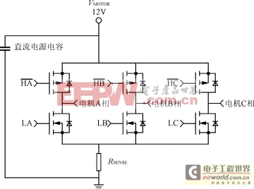 电流传感电阻器RSENSE如图3所示,它可调节功率级和直流无刷电机的最大电流。如果RSENSE两端的电压超过电流限制门限电平,则可通过把输出驱动器LA、LB和LC关断一定的时间,来实现电流的调节。