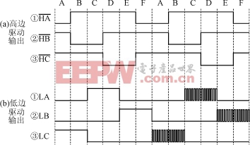 N沟道管输出和P沟道管输出,共有6个组合(6种开关状态),它们构成了一个完整的换向循环周期。这6种组合在图6和表2中予以说明,并用状态A、B、C、D、E、F分别作标记。该时序已编程在换向状态机器中。换向状态机器的时钟脉冲是由VCO压控振荡器来提供的。