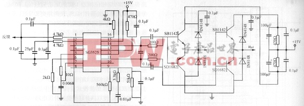 推挽升压式电路的控制及驱动由PWM专用集成电路SG3525的两路输出经射随功放器来完成。图7为双端推挽升压式控制及驱动实验电路图。