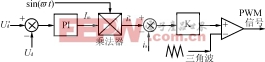 图5给出了PWM整流电路控制系统的一相结构简图。采用双环控制,其外环为直流电压控制环,内环为交流电流控制环。直流输出电压给定信号Ud*和实际的直流电压Ud比较后的误差信号送入PI调节器,PI调节器的输出即为整流器交流输入电流的幅值,它与标准正弦波相乘后形成交流输入电流的给定信号ia*(ib*、ic*),与实际的交流输入电流ia(ib、ic)进行比较,电流误差信号经比例调节器放大后送入比较器,再与三角载波信号比较形成PWM信号。该PWM信号经驱动电路后去驱动主电路开关器件,便可使实际的交流输入电流跟踪指令值,同时达到控制输出电压的目的。