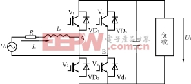 本文研制的UPS采用三相PWM整流电路,其电路结构如图2所示,开关器件采用IGBT。为了更好地说明其工作原理,首先介绍单相PWM整流电路的工作原理。![]()