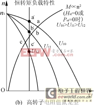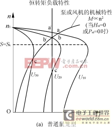 从图6可以看出:调压调速应用于普通鼠笼型电动机时,如果负载是恒转矩型,则可调速的范围极小,只能从同步转速n1至n1sk转速范围内调速。当定子电压由U10降至U20时,运行点由a′变至b′,其转速变化是很小的,所以恒转矩负载不适用普通鼠笼型电动机,而应采用高转子电阻值的鼠笼型电动机。但叶片式泵与风机属于M∝n2型特性负载,采用普通鼠笼型电动机调压调速时,可以得到较大的调速范围,如图6(a)所示,当定子电压由U10降至U20、U30时,运行点由a变至b、c。c点虽交于电动机特性曲线的曲线段,但仍能稳定运行。当然,叶片式泵与风机采用高转子电阻值的鼠笼型电动机调压调速时,其调速特性会更好一些,见图6(b)所示。